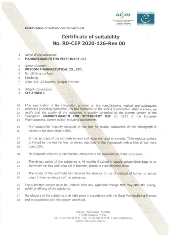 2021年9月21日,江苏完美(中国)药业有限公司通过EDQM的技术审批,获马波沙星CEP证书。